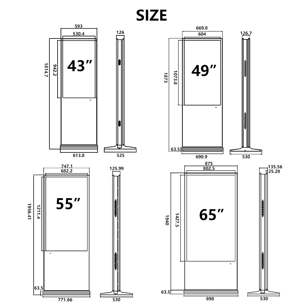 Indoor Floor-standing Digital Signage like a beautiful girl who has long legs. The installation method of this machine is floor-standing, and available in 32-98 inch sizes. It has high definition and resolution which support 4K display. The operating system is Android, you can also customize Windows OS. This machine can meet many of needs, such as advertising display in shopping mall, supermarket and subway. You can according your needs to choose.