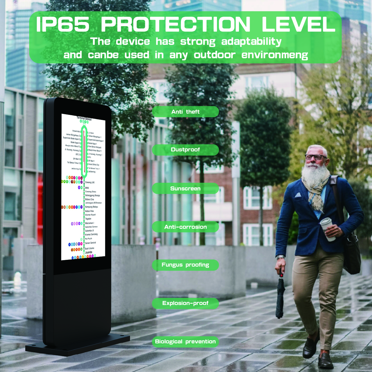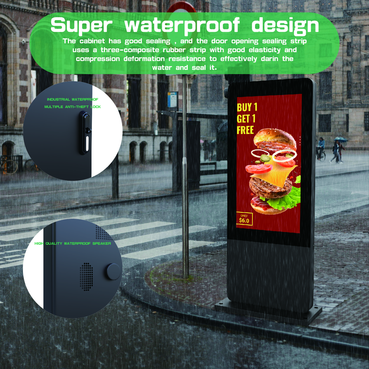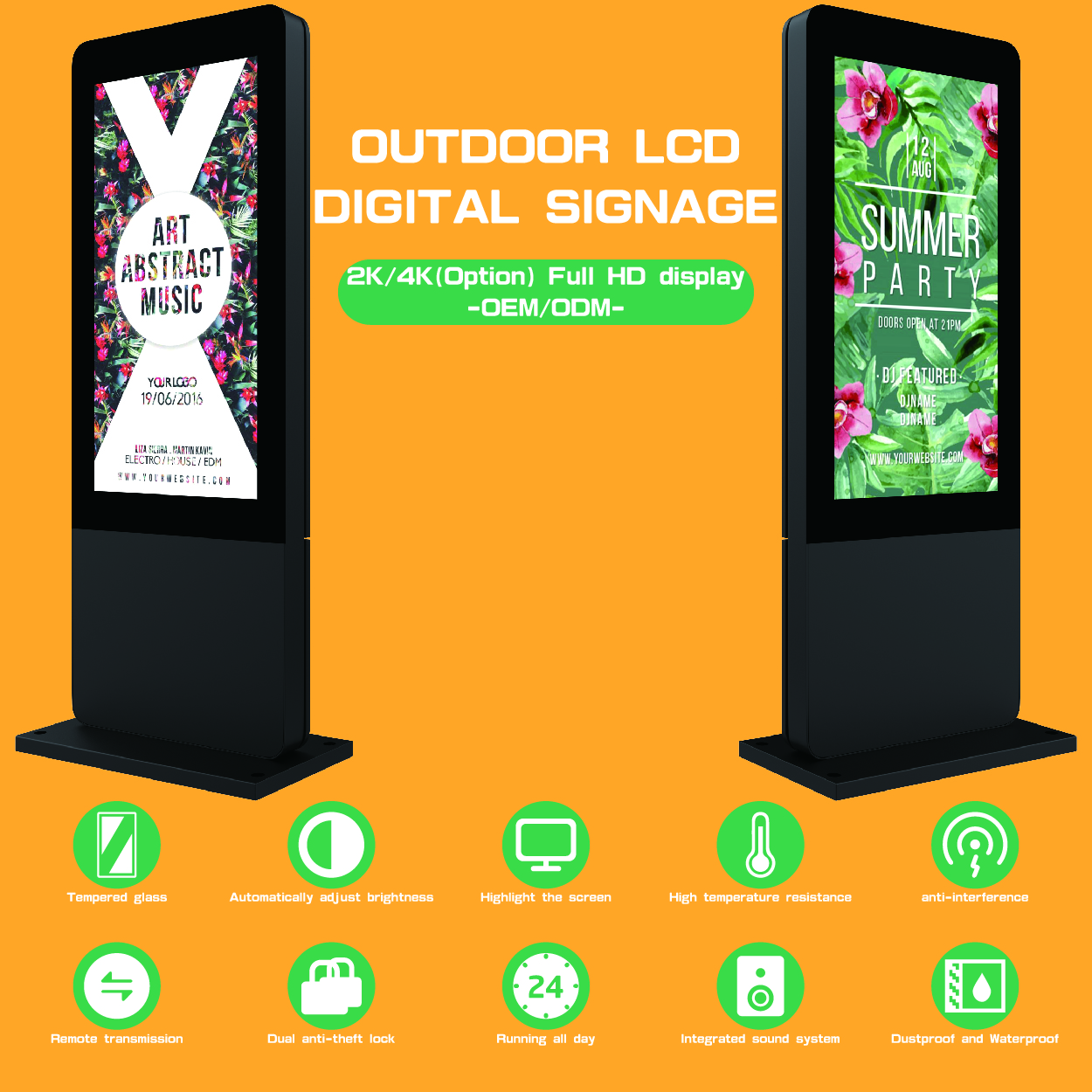 The outdoor floor-standing digital signage like a tough soldier in the wind because its waterproof level has reached IP65 and it can adapt all kinds of inclement weather. High brightness and resolution make it can clearly display the content. The size can be customized, the different size can meet your different needs. Imported axial flow fan is adopted, with fan speed control plate, which has automatic temperature sensing, automatic adjustment of fan speed, which can save energy and power.