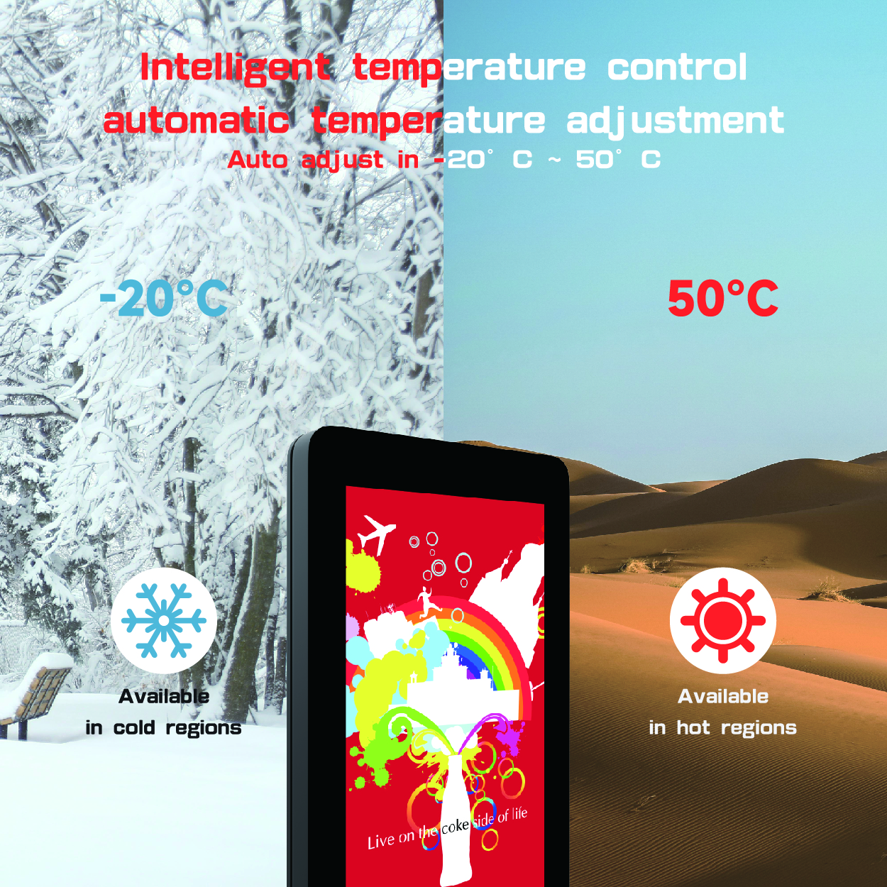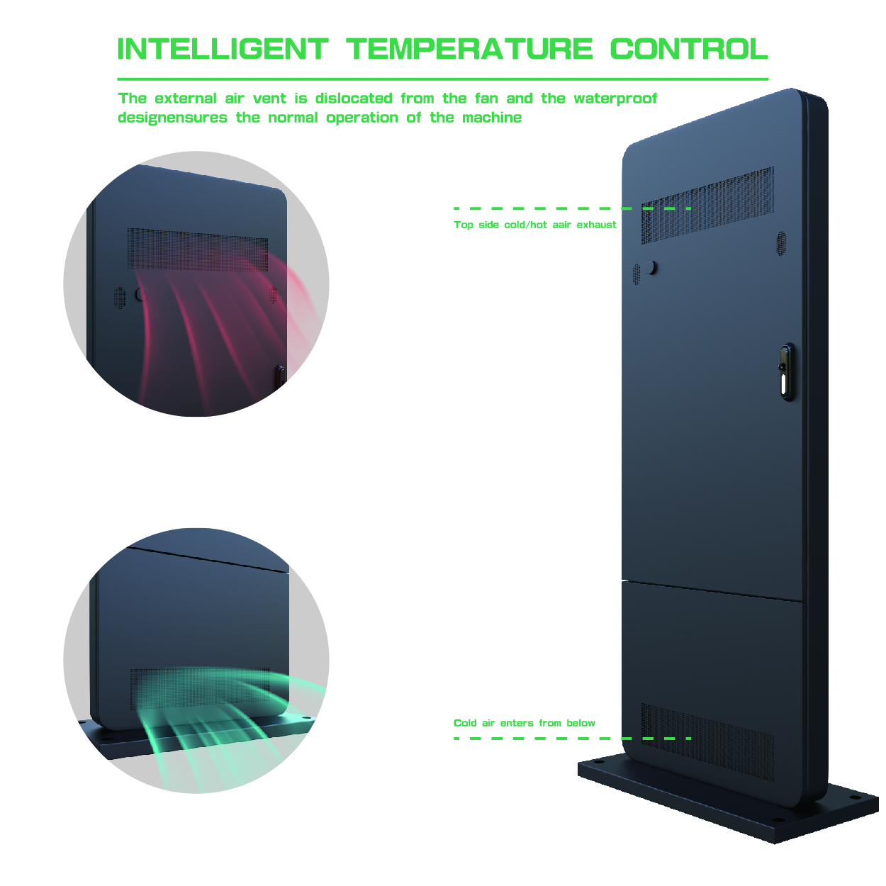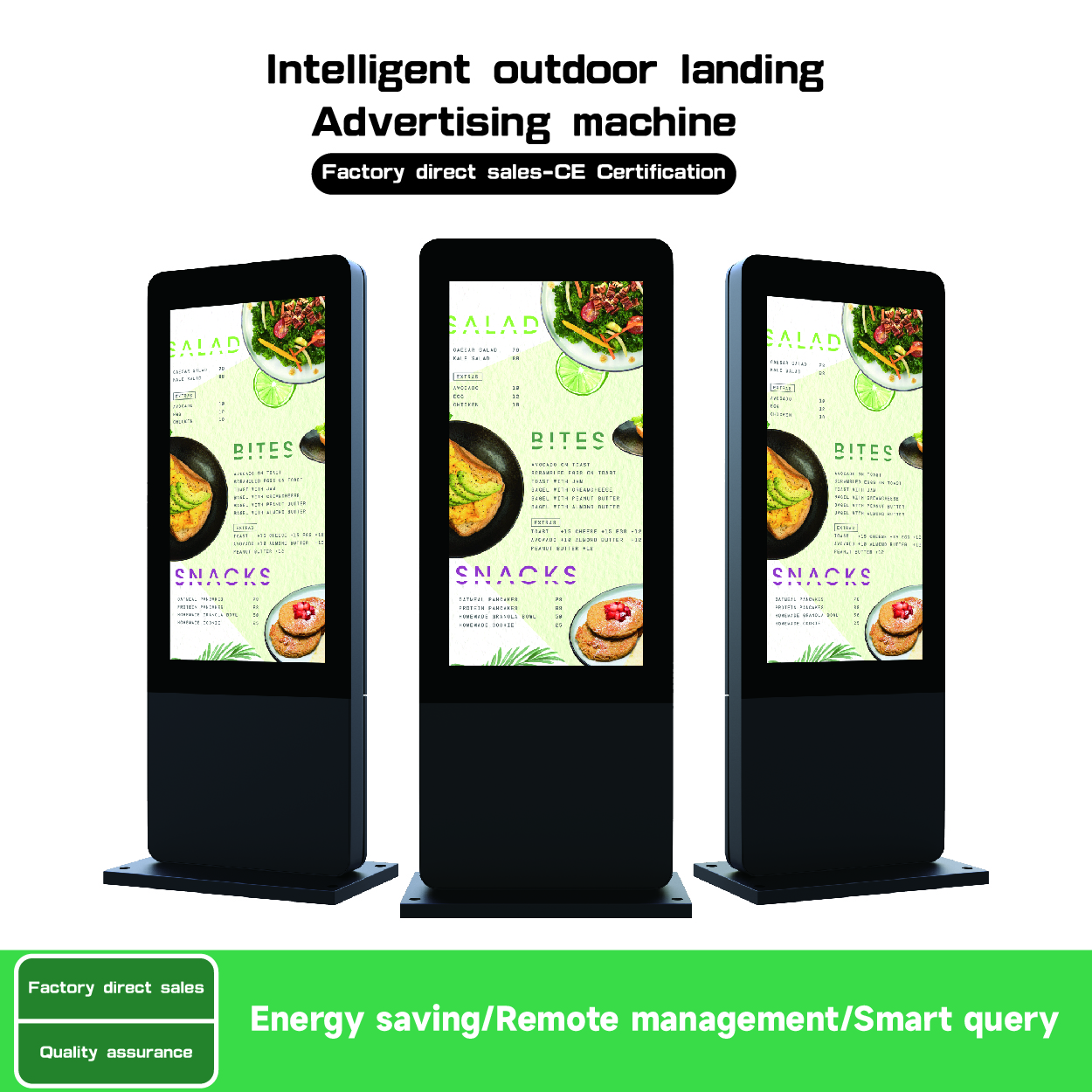The outdoor floor-standing digital signage like a tough soldier in the wind because its waterproof level has reached IP65 and it can adapt all kinds of inclement weather. High brightness and resolution make it can clearly display the content. The size can be customized, the different size can meet your different needs. Imported axial flow fan is adopted, with fan speed control plate, which has automatic temperature sensing, automatic adjustment of fan speed, which can save energy and power.